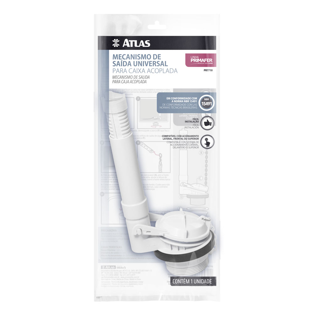 O Mecanismo de Saída Universal da ATLAS é o componente responsável por liberar a água da caixa acoplada para a descarga do vaso sanitário quando o botão é acionado. Ele garante a vedação completa e eficiente do fundo da caixa, prevenindo vazamentos e o desperdício de água.