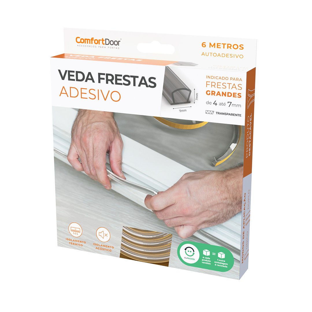 O produto é o Veda Frestas Adesivo Comfortdoor 7x9mm, TRANSPARENTE, com 6 metros.
